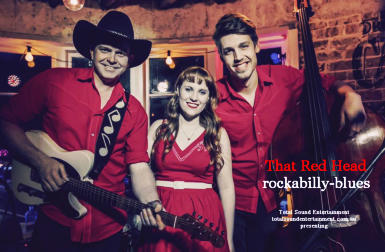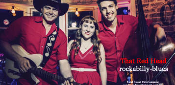 ThatRedHeadisSydneyblues-abillydeluxe.Lozzisaswildonthemicassheisonthedrums.Hittingthoserock’n’roll wildcat vocals while never losing a snappin’ backbeat. Yes,folks,wearetalkingWandaJacksonupstairsandGeneKrupadownstairs.Askanyoftheraptaudiences ThatRedHead hasthrilledatSydney’sretrofairs,50’sdays,streetfestivals,rock’n’rollthemebarsandbeyond.Theykeepcomingback. That Red Head is rapidly building up a head of steam as one of the acts to watch. These guys are going off!!!